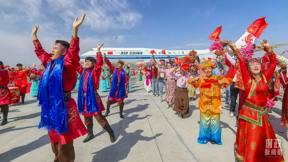 △乌鲁木齐天山国际机场,新疆各族群众热烈欢迎到来。(总台央视记者范凯、史伟拍摄)