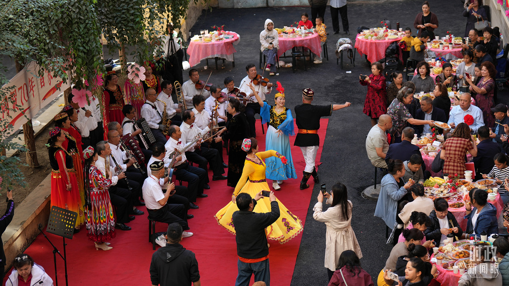 △乌鲁木齐街头,新疆各族群众热烈欢迎到来。(总台记者高帅、总台央视记者韩锐拍摄)